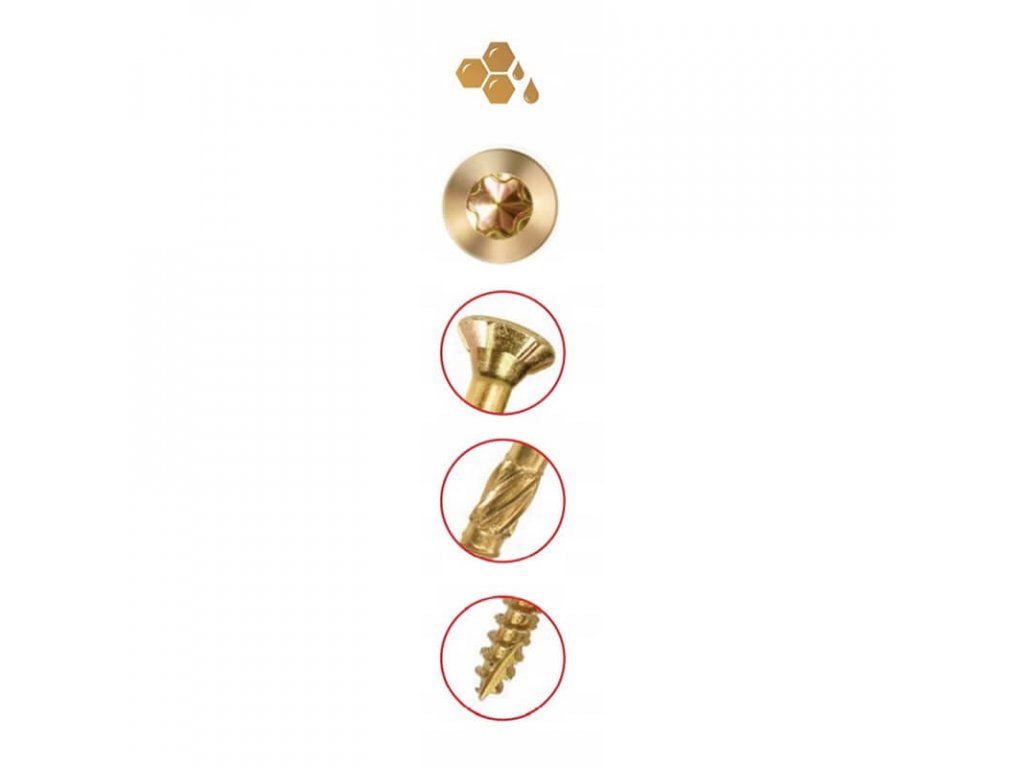 Vyrobené sú z nízkouhlíkovej ocele s fosfátovou úpravou. Skrutky majú zápustnú hlavu, ktorá zaisťuje zarovnanie skrutky v inštalovanom prvku. Konštrukcia závitu zaručuje spoľahlivé a trvanlivé upevnenie na drevo a výrobky na báze dreva. Jeho ostrý hrot umožňuje rýchlu inštaláciu.