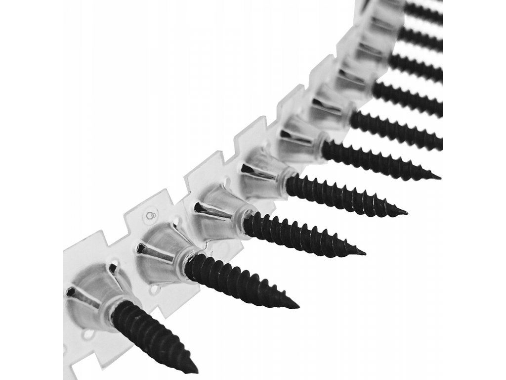 Fosfátované skrutky prestížnej značky SENCO materskej svetovej firmy KYOCERA ponúkajú kvalitné prevedenie a vyššiu kvalitu spracovania voči bežnej konkurencii. Skrutky sú spojené plochou typizovanou plastovou páskou čo zabezpečuje kompatibilitu s rôznymi značkami náradia na trhu.Používajú na montáž sadrokartónových dosiek na kovové profily. Pasujú do skrutkovačov s pásovým podávačom v elektrických a akumulátorových verziách a vŕtacích nástavcov. Tieto skrutky v pásoch extrémne zvyšujú rýchlosť efektivitu práce.