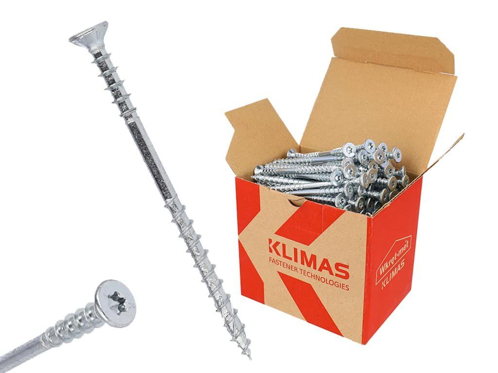 Dištančné skrutky renomovanej firmy Klimas Wkręt-met s INOVATÍVNYM DIZAJNOM, hniezdom TORX pre presné vyrovnanie a zarovnanie drevených konštrukcií, latovania, dosiek a iných.