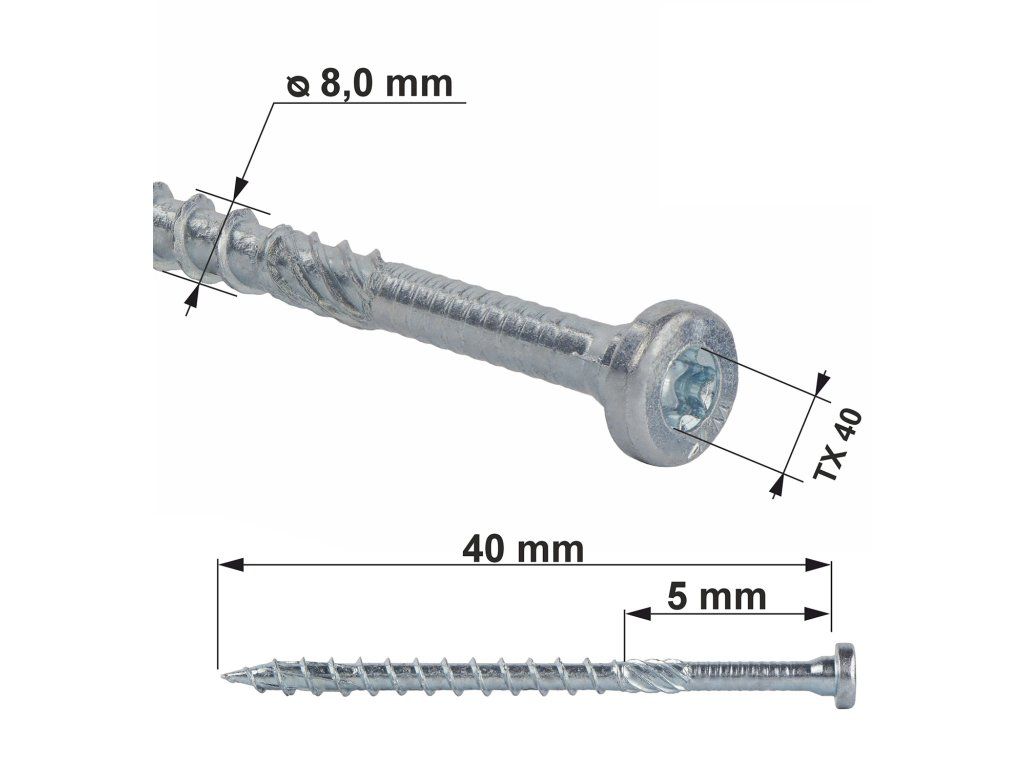 Rozšírený priemer skrutky pod hlavou zvyšuje odolnosť voči strihu a zabezpečuje dokonalé prispôsobenie otvorom v tesárskych spojkách. Sfazovaná časť pod hlavou umožňuje bezproblémové uloženie skrutky do otvoru.