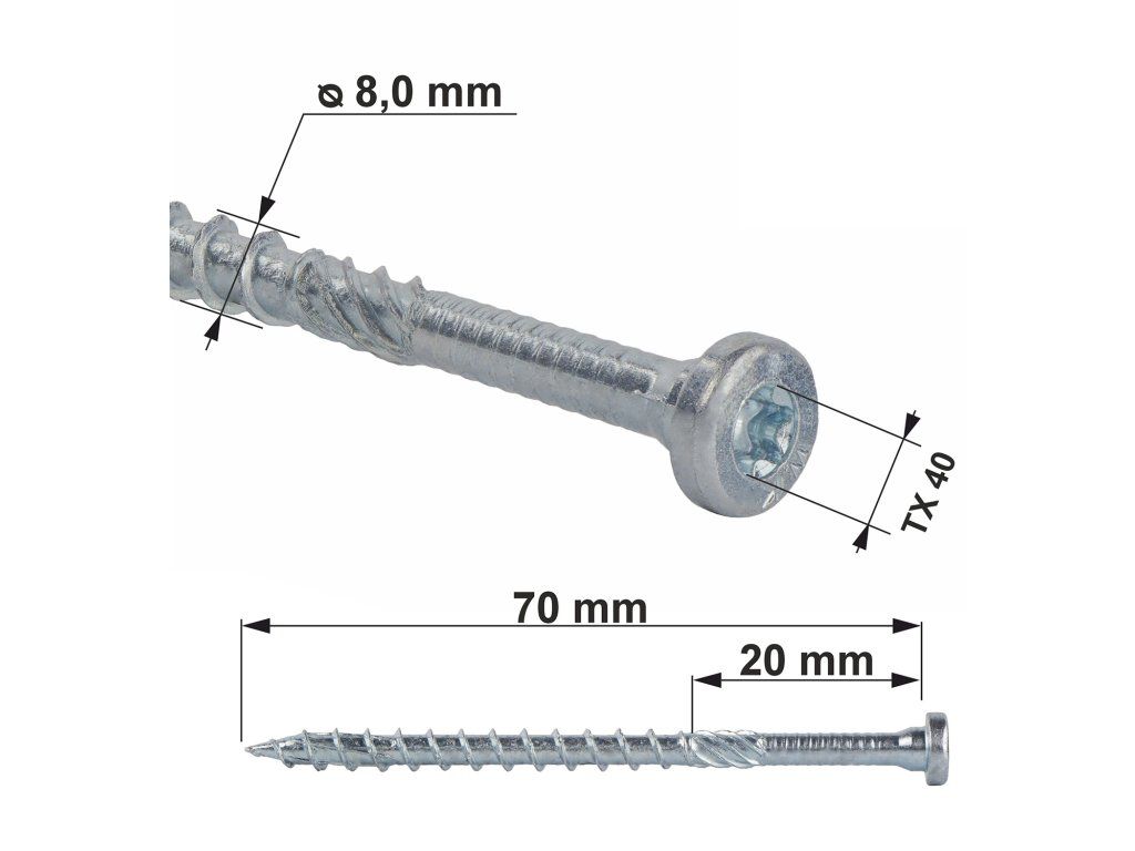 Rozšírený priemer skrutky pod hlavou zvyšuje odolnosť voči strihu a zabezpečuje dokonalé prispôsobenie otvorom v tesárskych spojkách. Sfazovaná časť pod hlavou umožňuje bezproblémové uloženie skrutky do otvoru.